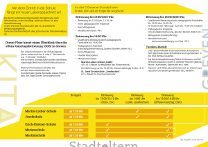 Mit unserem Flyer wollen wir Ihnen einen Überblick zu den Betreuungsangeboten nach Schulschluss ("Verlässliche Schule", "Übermittagsbetreuung ohne Mittagessen" und "Offene Ganztagsschule, OGS") sowie über ausgewählte Betreuungsangebote in den Ferienzeiten geben. Da die Grevener Grundschulen unterschiedliche Konzepte verfolgen, kann es in Einzelfällen auch die Entscheidung für oder gegen eine Schule beeinflussen. Hier geht es zum Download des Flyers.